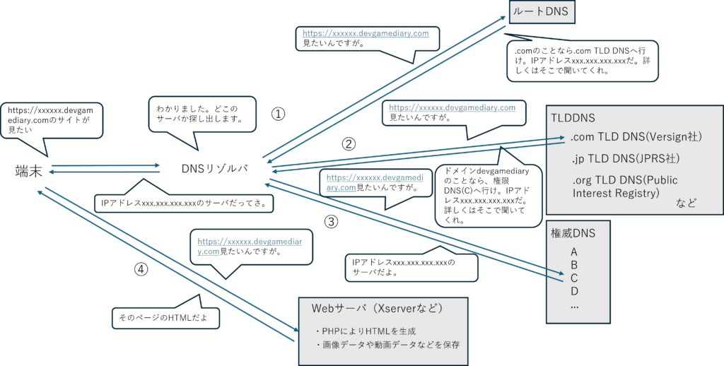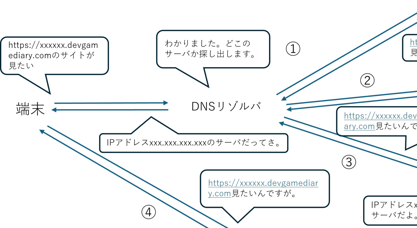 DNSリゾルバはいろんな人に聞きまわってhttps://xxxxxx.devgamediary.comが結局どこのサーバにあるのかを教えてくれます。なんか新入社員みたいですね。